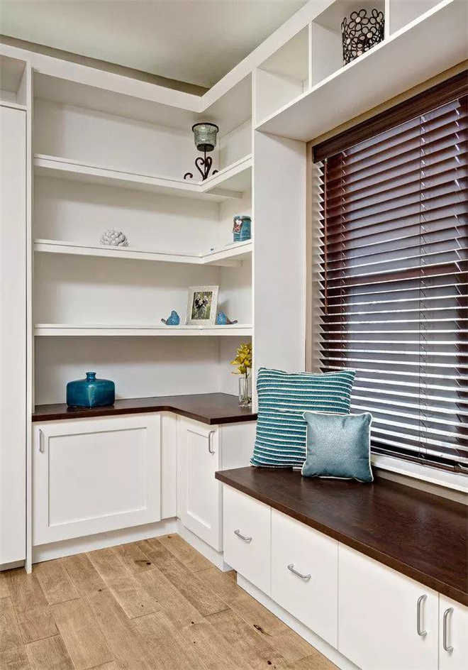 中間的窗戶想做成飄窗,但是這樣一來邊上得空出一塊地,說大不大,說小又令人難以忽視。別忘了萬能的擱板!量好靠墻兩邊的尺寸,做成一個展示柜或者收納架,美觀又大方。