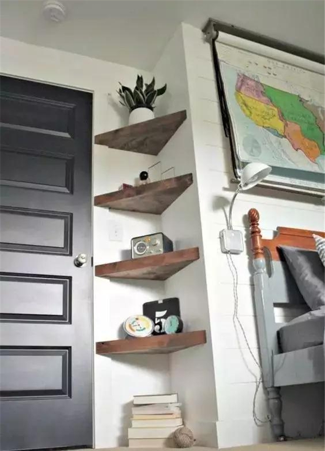 這樣尷尬的轉角怕是不少見吧,多花一點心思,垂直墻角打上幾塊三角擱板,裝飾還是收納隨心而定,再也不怕被戶型壓制了,下雨天氣還可以放個雨傘桶,濕漉漉的東西便有了留置地。