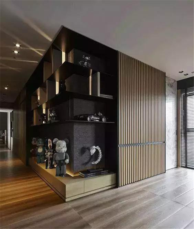 不想打破方形的整潔規矩,轉角同樣可以別具一格。嵌入式收納柜絲毫不會影響表面的平整,推拉門的加入讓收納空間隱于無形。