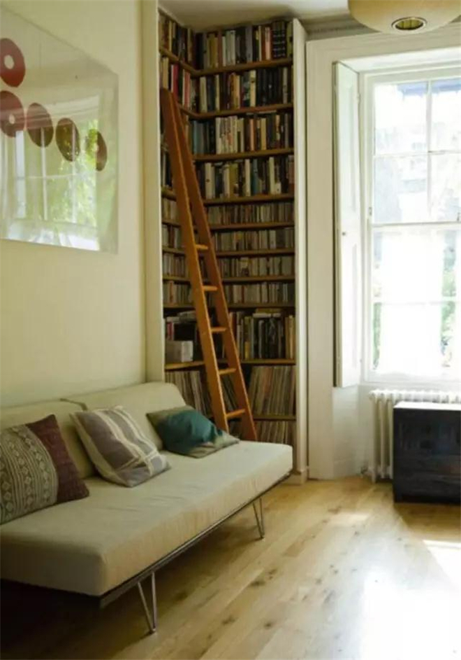 沙發旁邊的小轉角,剛開始干干凈凈的,時間一久難免會變成雜物堆放區。這樣裝上書架,化身成為家里的文化空間,完全是詩和遠方的心靈享受。